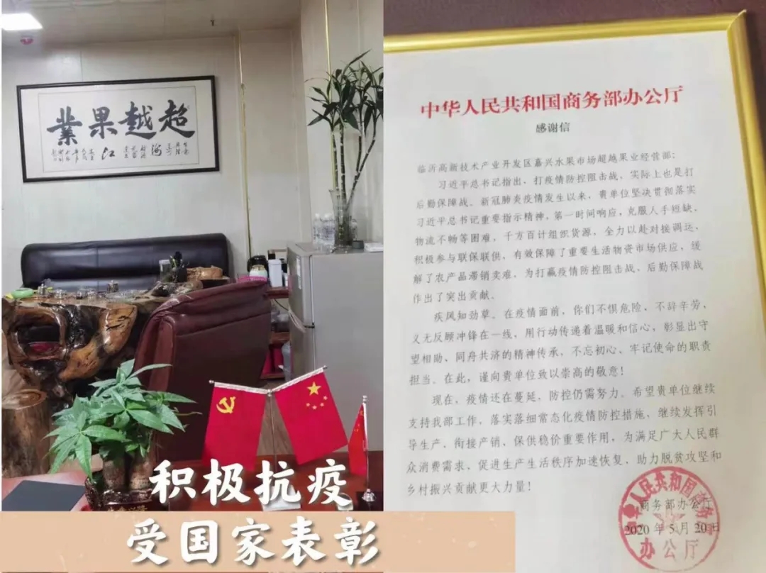 在去年的疫情期间,杨文超带领公司员工积极抗疫,响应国家号召,参与民生支援工作。超越果业从而获得了国家商务部的表彰。